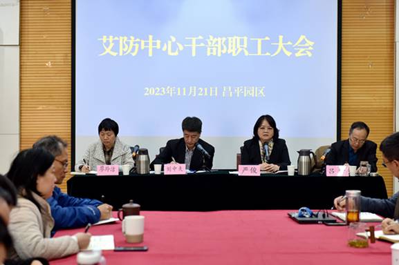 按照中国疾控中心党委扩大会议的工作部署与要求,2023年11月21日上午,中国疾病预防控制中心性病艾滋病预防控制中心(以下简称“艾防中心”)召开全体干部职工大会。中国疾控中心党委委员、副主任严俊同志莅临会议并讲话。艾防中心党委书记刘中夫同志,党委委员、副主任吕繁同志,党委委员廖玲洁同志出席会议。会议由吕繁同志主持。