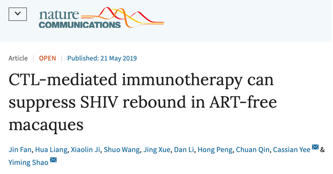 「2」 Jin Fan, Hua Liang, Xiaolin Ji, Shuo Wang, Jing Xue, Dan Li, Hong Peng, Chuan Qin, Cassian Yee & Yiming Shao. CTL-mediated immunotherapy can suppress SHIV rebound in ART-free macaques, Nature Communications (2019). DOI: 10.1038/s41467-019-09725-6