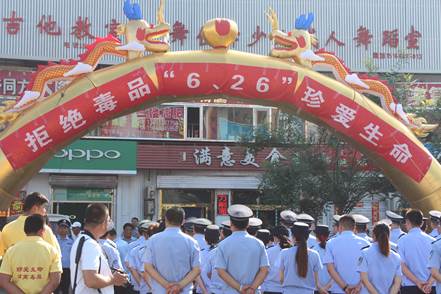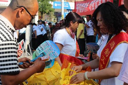 为烘托气氛,活动组织秧歌队、组织公安方队、学生方队、疾控方队2000余人,身披艾滋病宣传绶带,高举禁毒防艾宣传横幅,沿主要街道巡走一圈,并向沿街大众发放宣传材料。在活动现场,工作人员通过设立宣传展牌、悬挂横幅、发放宣传折页和宣传品等方式,向过往路人宣传毒品危害及艾滋病防治知识,号召并动员广大人民群众了解、支持、参与禁毒防毒斗争,预防和减少涉毒违法犯罪行为,倡导更多的市民远离毒品。一块块精心制作的宣传展牌,一幅幅触目惊心的图片,吸引了很多行人驻足关注。这次活动,共计发放艾滋病宣传单5000余份,艾滋病宣传折页1200份、安全套2352个、宣传品扑克、手提袋、扇子各种类共计3000份,接受群众现场咨询100余人次,受益群众达数千余人次。