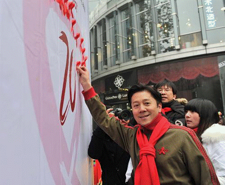 11月29日,演员濮存昕在活动现场进行艾滋病快速检测, 歌手蔡国庆在活动现场粘贴红丝带。。当日,由北京市卫生计生委、北京佑安爱心家园、美国艾滋病健康基金、中国性病艾滋病防治协会等共同举办的“世界艾滋病日主题大型广场知识宣传及检测”活动在北京三里屯广场举行,此次活动的口号是“早检测早治疗关爱健康”。志愿者们向市民介绍预防艾滋病知识、发放防护用具。现场还设置了检测车,让参与者进行免费的艾滋病检测。(来源:新华社 李文/摄影)