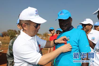图为中国第八批赴南苏丹(瓦乌)维和医疗队官兵为西战区工作人员佩戴红丝带。新华网发(刘明利摄)