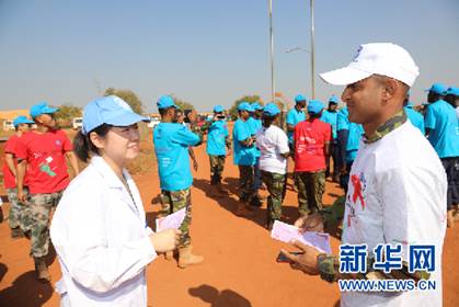 图为中国第八批赴南苏丹(瓦乌)维和医疗队官兵发放健康宣传单。新华网发(刘明利摄)
