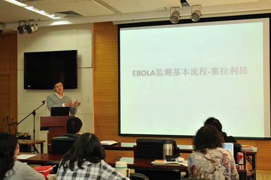 本期午间论坛的演讲者是首批参加援非公共卫生师资培训队的王晓春和张大鹏两位同志。2014年11月,性艾中心王晓春和张大鹏作为中国疾控中心第二批执行援非任务的公共卫生专家前往塞拉利昂帮助当地开展埃博拉疫情防控工作。王晓春主任讲授了这段特殊工作经历和亲身感受,张大鹏介绍了埃博拉监测流程等。到达目的地以后,他们用最快的速度熟悉了当地公共卫生工作状况,并结合实际,在最短的时间内制定工作计划,编写、演练培训教程,在抵达后的第3天即开办了第一期培训班,在当地成功打开了工作局面。在不到2个月的时间里他们边干边摸索,边干边总结,对培训教程反复修改,调整,用最通俗易懂的语言讲解最严谨周密的防控程序。他们都成为当地最受欢迎的教员。